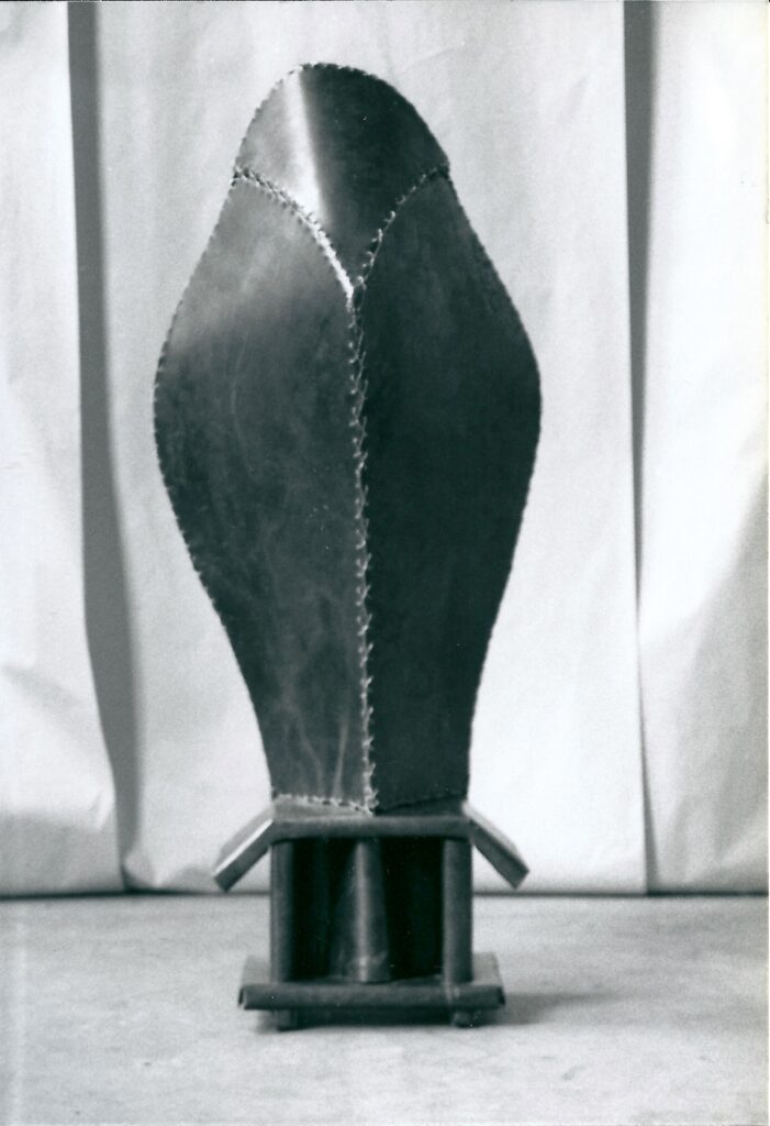 Dit figuur is in ongeveer 1988 gemaakt. Het ontwerp is naar aanleiding van een sluitertje voor plastic zakken dat ik op straat vond. Kenmerkend is dat het bovenstuk bestaat uit met ijzerdraad aan elkaar geregen staalplaten. Het onderste deel is van hout en bekleed met staalplaat. En lijkt wel wat op een stoofje. Rechts zie je dat ik de laatste hand leg aan het beeldje dat ongeveer 70cm hoog is.