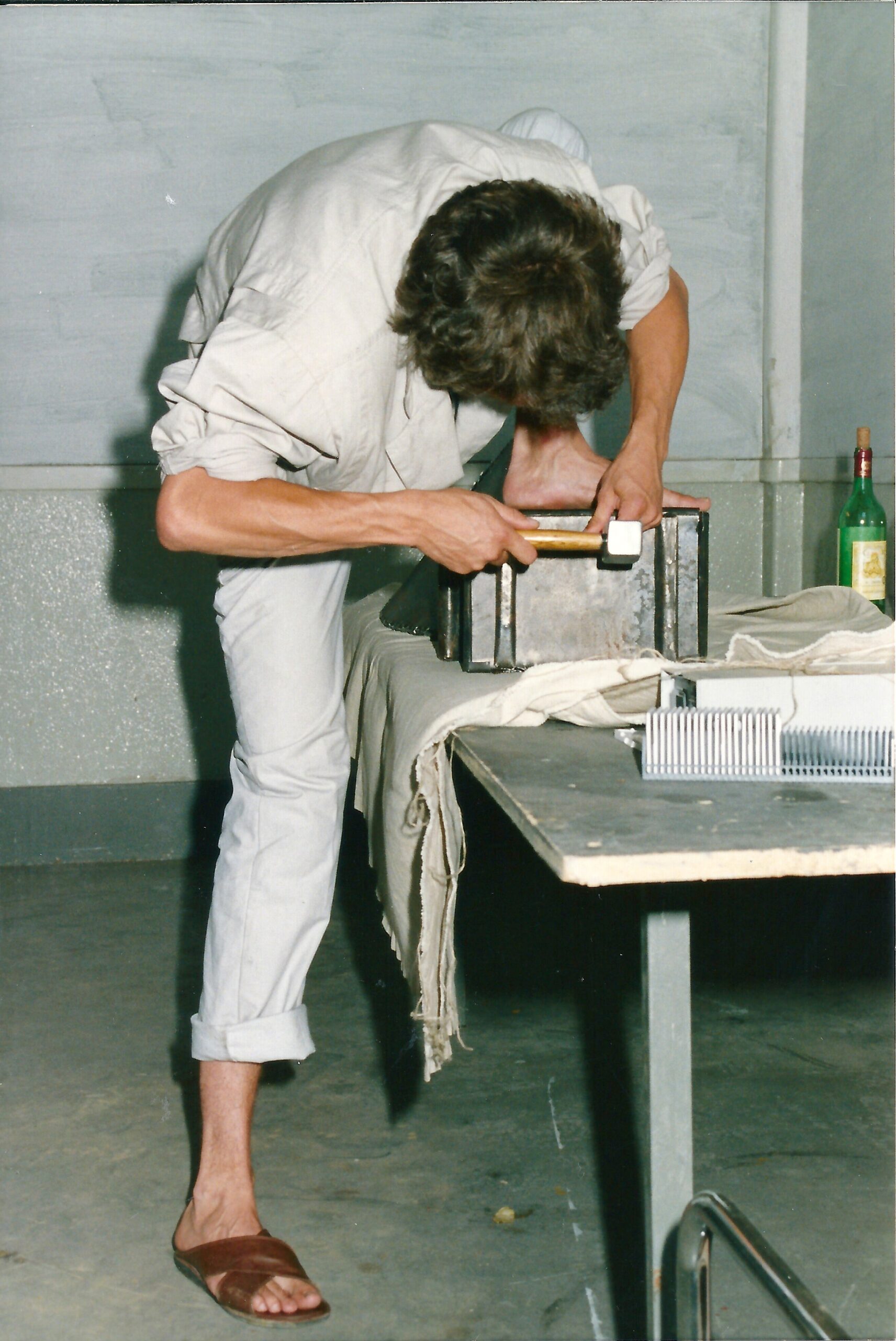 Dit figuur is in ongeveer 1988 gemaakt. Het ontwerp is naar aanleiding van een sluitertje voor plastic zakken dat ik op straat vond. Kenmerkend is dat het bovenstuk bestaat uit met ijzerdraad aan elkaar geregen staalplaten. Het onderste deel is van hout en bekleed met staalplaat. En lijkt wel wat op een stoofje. Rechts zie je dat ik de laatste hand leg aan het beeldje dat ongeveer 70cm hoog is.